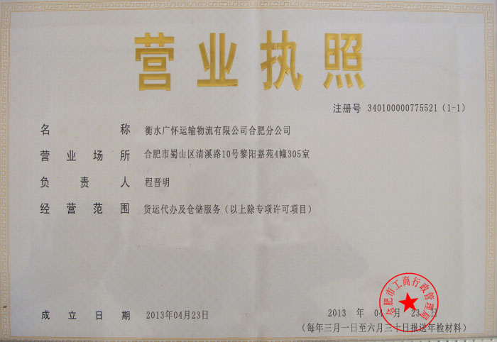 衡水广怀运输物流有限公司合肥分公司营业执照(正本)
